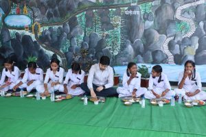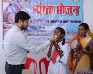 उत्तर बस्तर कांकेर, 01 मार्च 2024/ प्रधानमंत्री पोषण शक्ति निर्माण योजना के तहत जिले के स्कूलों में न्योता भोज की शुरूआत आज से की गई। इसी क्रम में कलेक्टर श्री अभिजीत सिंह ने कांकेर विकासखण्ड के ग्राम नंदनमारा स्थित शासकीय पूर्व माध्यमिक शाला में जाकर विद्यार्थियों के साथ न्योता भोज किया। इस दौरान उन्होंने कक्षा 7वीं की छात्रा कुमारी जाह्नवी सोनकर के जन्म दिन के अवसर पर उसे केक खिलाकर सभी विद्यार्थियों को चॉकलेट वितरित किया।