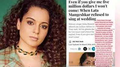 बॉलीवुड अभिनेत्री कंगना रनोट ने अपने इंस्टाग्राम अकाउंट पर भारत की स्वर कोकिला लता मंगेशकर का के इंटरव्यू आर्टिकल का स्क्रीनशॉट शेयर करते हुए उनकी तारीफ की और बताया कि कैसे करोड़ों मिलने पर भी उन्होंने कभी किसी शादी में परफॉर्म नहीं किया. इसके साथ ही उन्होंने खुद की लता मंगेशकर से तुलना भी की. कंगना ने उस इंटरव्यू का हिस्सा शेयर किया, जिसमें लता मंगेशकर ने कहा था- “अगर आप मुझे पांच मिलियन डॉलर भी देंगे तो भी मैं नहीं आऊंगी.”