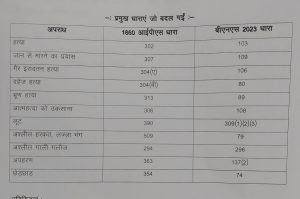 इस माह (जुलाई-2024) से सरकार बीएनएस (भारतीय न्याय संहिता) लागू कर दी है। आईपीसी में 511 धाराएं थीं, जबकि बीएनएस में 358 धाराएं है। 175 धाराएं बदल गई हैं, 18 नई जोड़ी गई हैं, साथ ही 22 धाराएं खत्म हो गई है। इसी तरह सीआरपीसी में में 533 धाराएं है, इनमें 160 धाराए बदली गई हैं। नौ नई धारा जोड़कर नौ को खत्म कर दिया गया है। इसमें पूछताछ से ट्रायल तक सुनवाई वीडियो कॉन्फ्रेंसिंग से करने का प्रावधान हो गया है।
