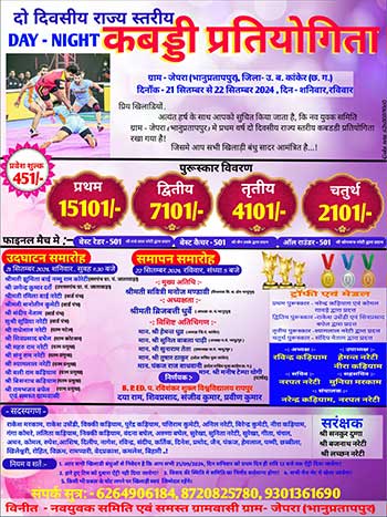 भानुप्रतापपुर – ग्राम जेपरा नवयुवक समिति एवं समस्त ग्रामवासीयों द्वारा प्रथम बार दो दिवसीय (डे – नाईट)कबड्डी प्रतियोगिता का आयोजन दिनांक 21/09/2024 से 22/09/2024 दिन शनिवार रविवार तक जिसमे आपके टीम को सादर आमंत्रित है l