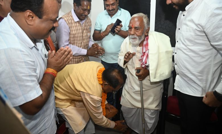 रायपुर, 26 सितम्बर 2024/मुख्यमंत्री श्री विष्णुदेव साय अपने बचपन के स्कूली शिक्षक श्री राजेश्वर पाठक से मुलाकात कर भाव विभोर हो गए। उन्होंने अपने स्कूल के दिनों को याद किया और अपने शिक्षक का चरण स्पर्श कर अभिवादन किया। मुख्यमंत्री ने उन्हें शाल एवं श्रीफल भेंट कर सम्मानित भी किया। मुख्यमंत्री ने कहा कि गुरूजनों का ही आशीर्वाद है कि मैं यहां तक पहुंच पाया हूँ ऐसा कहते हुए उन्होंने अपने शिक्षक से फिर से आशीर्वाद मांगा और उनके शिक्षक ने भी पूरे दिल से आशीर्वाद दिया।