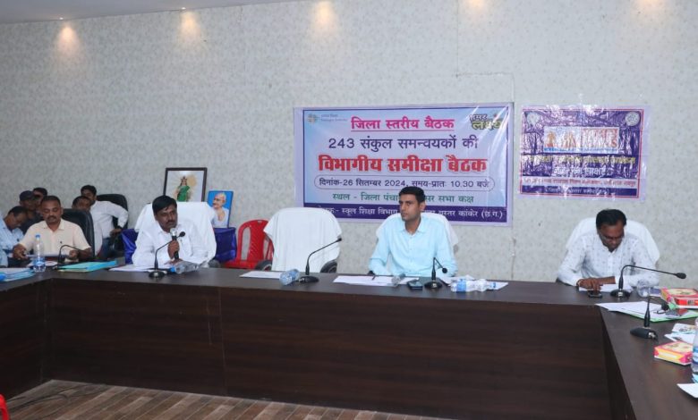उत्तर बस्तर कांकेर 26 सितम्बर 2024/ कलेक्टर श्री निलेश कुमार महादेश क्षीरसागर के निर्देशानुसार प्राथमिक एवं माध्यमिक स्तर के विद्यालयों में प्रशासनिक कसावट एवं शैक्षणिक गुणवत्ता में सुधार हेतु विभिन्न बिन्दुओं पर समीक्षा बैठक जिला पंचायत के मुख्य कार्यपालन अधिकारी श्री सुमीत अग्रवाल की अध्यक्षता में आयोजित की गई, जिसमें शैक्षिक गतिविधियों की एजेंडावार एव विकासखंडवार समीक्षा की गई। सीईओ श्री अग्रवाल ने संकुल समन्वयकों को निर्देशित किया कि वे नियमित रूप से विद्यालय की मानिटरिंग कर विद्यालय के मूलभूत आवश्यकता के साथ-साथ योजनाओं का क्रियान्वयन तथा बच्चों के शैक्षणिक गुणवत्ता पर विषेष ध्यान दें। बच्चों को किताबी ज्ञान के साथ साथ प्रतियोगी परीक्षा की जानकारी तथा विद्यालय स्तर पर तैयारी कराई जावे। उन्होंने विभाग में चल रहे शैक्षणिक कार्यों के लिए प्रशंसा करते हुए जवहर नवोदय, सैनिक स्कूल, एकलव्य विद्यालय, प्रयास विद्यालय, जाति प्रमाण पत्र, आय प्रमाणपत्र, राष्ट्रीय साधन सह छात्रवृत्ति परीक्षा की तैयारी की भी समीक्षा की।