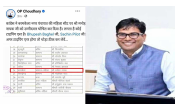 उन्होंने अपने सोशल मीडिया एक्स पर कांग्रेस प्रत्याशियों की सूची साझा करते हुए लिखा कि कांग्रेस ने बरमकेला नगर पंचायत की महिला सीट पर मनोहर नायक को उम्मीदवार घोषित कर दिया है. लगता है कोई टाइपिंग एरर है. वित्त मंत्री चौधरी ने इसके लिए पूर्व मुख्यमंत्री भुपेश बघेल और कांग्रेस प्रदेश प्रभारी सचिन पायलट को टैग करते हुए लिखा कि अगर टाइपिंग एरर होगा तो थोड़ा ठीक कर लेवें.