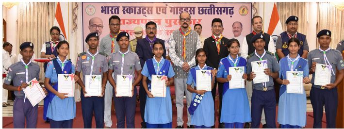 रायपुर, राज्यपाल श्री रमेन डेका के मुख्य आतिथ्य में आज राजभवन में स्काउट्स और गाइड्स छत्तीसगढ़ राज्यस्तरीय अलंकरण समारोह आयोजित किया गया। समारोह में राज्यपाल श्री डेका ने राज्य के सर्वश्रेष्ठ स्काउटर, गाइडर, रोवर, रेंजर, एवं स्काउट-गाइड को राज्यपाल पुरस्कार से सम्मानित किया। इस अवसर पर उन्होंने कहा कि जलवायु परिवर्तन की समस्या को देखते हुए प्रकृति और पर्यावरण को सुरक्षित रखना हम सबकी सबसे बड़ी जिम्मेदारी है। स्काउट्स एवं गाइड्स को इसमें अपना सक्रिय योगदान देना होगा। उन्होंने सभी से एक पेड़ मां के नाम पर लगाने और दोस्तों एवं परिजनों को भी इसकेे लिए प्रेरित करने की बात कही।