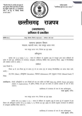 रायपुर, सामान्य प्रशासन विभाग ने छत्तीसगढ़ सिविल सेवा (आचरण) नियम, 1965 में संशोधन अधिसूचित किया है, जिसके तहत भारत सरकार के प्रावधानों की तर्ज पर अब राज्य के शासकीय सेवकों को शेयर (Shares), प्रतिभूतियों (Securities), डिबेंचर्स (Debentures) और म्युचुअल फंड्स (Mutual Funds) में निवेश की अनुमति दी गई है। यह संशोधन नियम 19 में नया उप-खण्ड जोड़ते हुए लागू किया गया है, जिसका उद्देश्य वित्तीय लेनदेन में पारदर्शिता सुनिश्चित करना है।