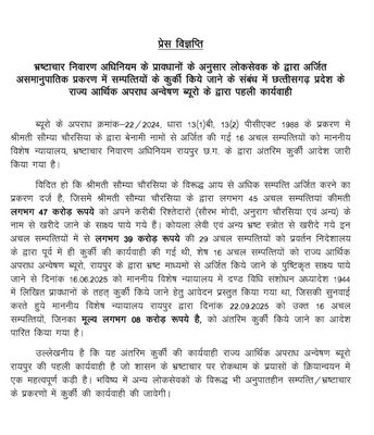 विदित हो कि श्रीमती सौम्या चौरसिया के विरूद्ध आय से अधिक सम्पत्ति अर्जित करने का प्रकरण दर्ज है, जिसमें श्रीमती सौम्या चौरसिया के द्वारा लगभग 45 अचल सम्पत्तियां कीमती लगभग 47 करोड़ रूपये को अपने करीबी रिश्तेदारों (सौरभ मोदी, अनुराग चौरसिया एवं अन्य) के नाम से खरीदे जाने के साक्ष्य पाये गये हैं। कोयला लेवी एवं अन्य भ्रष्ट स्त्रोत से खरीदे गये इन अचल सम्पत्तियों में से लगभग 39 करोड़ रूपये की 29 अचल सम्पत्तियों को प्रवर्तन निदेशालय के द्वारा पूर्व में ही कुर्की की कार्यवाही की गई थी, शेष 16 अचल सम्पत्तियों को राज्य आर्थिक अपराध अन्वेषण ब्यूरो, रायपुर के द्वारा भ्रष्ट माध्यमों से अर्जित किये जाने के पुष्टिकृत साक्ष्य पाये जाने से दिनांक 16.06.2025 को माननीय विशेष न्यायालय में दण्ड विधि संशोधन अध्यादेश 1944 में लिखित प्रावधानों के तहत् कुर्की किये जाने हेतु आवेदन प्रस्तुत किया गया था, जिसकी सुनवाई करते हुये माननीय विशेष न्यायालय रायपुर द्वारा दिनांक 22.09.2025 को उक्त 16 अचल सम्पत्तियों, जिनका मूल्य लगभग 08 करोड़ रूपये है, को अंतरिम कुर्की किये जाने का आदेश पारित किया गया है।