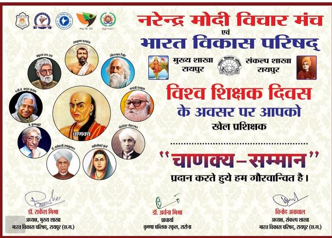 5 अक्टूबर 2025 को अंतर्राष्ट्रीय शिक्षक दिवस के उपलक्ष्य में खेल व्यायाम, योग एवं शिक्षाविदों का सम्मान किया जाना है इमें उन सभी योग्य शिक्षकों से जो कम से कम 5 वर्ष से अधिक अपना जीवन शिक्षा, अध्यापन अथवा प्रशिक्षण कार्य को समर्पित कर चुके है उन सभी का सम्मान भारत विकास परिषद और नरेंद्र मोदी विचार मंच के द्वारा किया जायेगा। इस हेतु प्राप्त आवेदन पत्र को बोर्ड मीटिंग में प्रस्तुत किया जाना है जो कि 4 अक्टूबर 2025 को शाम 4 बजे होगी। सभी चयनित शिक्षकों को 5 अक्टूबर 2025 दिन रविवार को सम्मानित किया जायेगा। ऐसे सभी शिक्षकों को अपनी योग्यता संबंधित जानकारी के लिए आवेदन करना आवश्यक है। अपना आवेदन हमारे मेल आईडी sehkarsevak@gmail.com पर कर सकते है। चयनित शिक्षकों को उनके मेल अथवा वाट्सअप में सूचित किया जायेगा।