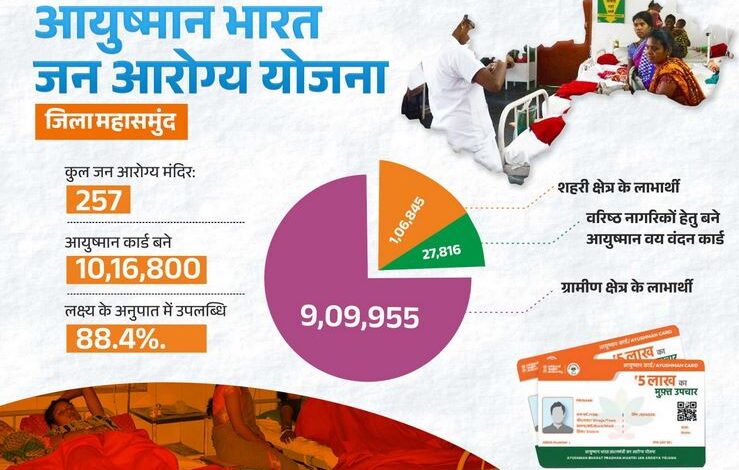 अब तक जिले में 10 लाख 16 हजार 800 हितग्राहियों के आयुष्मान कार्ड बन चुके हैं, जो निर्धारित लक्ष्य का लगभग 88.4 प्रतिशत है। इनमें ग्रामीण क्षेत्र के 9 लाख 9 हजार 955 और शहरी क्षेत्र के 1 लाख 6 हजार 845 लाभार्थी शामिल हैं। विकासखण्ड स्तर पर पिथौरा, बागबाहरा, बसना, सरायपाली और महासमुंद सभी क्षेत्रों में विशेष शिविरों एवं घर-घर संपर्क अभियान के माध्यम से कार्ड निर्माण का कार्य तीव्र गति से चल रहा है।