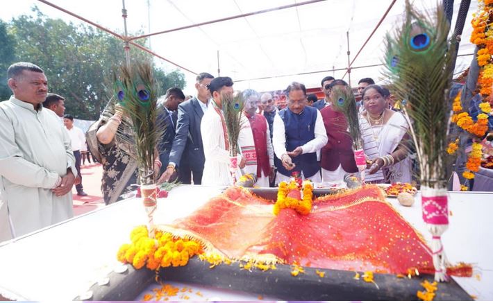 मुख्यमंत्री श्री विष्णुदेव साय ने सिटी ग्राउंड, जगदलपुर में बस्तर की आराध्य देवी मां दंतेश्वरी और भगवान बिरसा मुंडा के छायाचित्र सहित जनजातीय देवी-देवताओं की पूजा-अर्चना कर जनजातीय गौरव दिवस कार्यक्रम का शुभारंभ किया। इसके पश्चात अपने उद्बोधन में मुख्यमंत्री श्री साय ने कहा कि छत्तीसगढ़ शासन जनजातीय समुदाय के समग्र विकास के लिए पूरी तरह संकल्पित है।