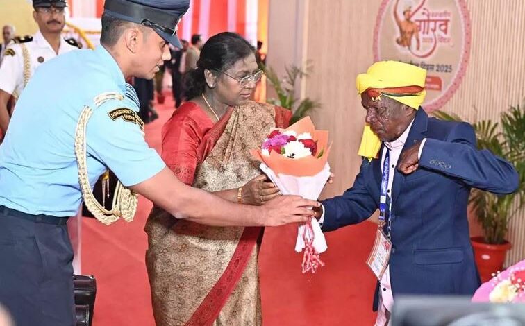 राष्ट्रपति द्रौपदी मुर्मु ने बसन्त पण्डो से कहा—“आप मेरे भी पुत्र हैं।” यह वाक्य सुनकर पूरा सभामंडप तालियों की गड़गड़ाहट से गुंज उठा, वहीं बसन्त पण्डो भावुक दिखाई दिए।
