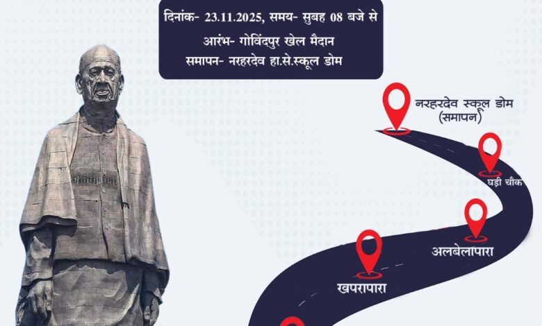 उत्तर बस्तर कांकेर 22 नम्बर 2025/ लौह पुरुष सरदार वल्लभभाई पटेल की 150वीं जयंती के अवसर पर युवाओं में राष्ट्रीय एकता, सम्मान और गौरव की भावना जागृत करने के उद्देश्य से रविवार 23 नवंबर को जिला प्रशासन द्वारा युनिटी मार्च पदयात्रा का आयोजन किया जाएगा।