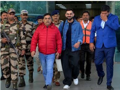 स्टार बल्लेबाज विराट कोहली दक्षिण अफ्रीका के खिलाफ वनडे सीरीज के लिए लंदन से भारत आ चुके हैं। बुधवार को वह पूर्व कप्तान महेंद्र सिंह धोनी के शहर रांची में पहुंचे जहां उनकी एक झलक पाने के लिए फैंस बेकरार दिखे। एयरपोर्ट पर उनका स्वागत करने क्रिकेटर सौरभ तिवारी पहुंचे थे। टेस्ट सीरीज के बाद अब दक्षिण अफ्रीका से वनडे सीरीज खेली जाएगी जिसका पहला मैच 30 नवंबर को रांची के जेएससीए इंटरनेशनल स्टेडियम में खेला जाएगा।