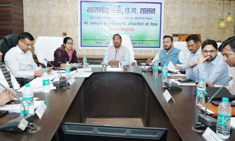 उत्तर बस्तर कांकेर / कृषि विकास एवं किसान कल्याण तथा जैव प्रौद्योगिकी, मंत्री श्री रामविचार नेताम ने आज कांकेर में बस्तर संभाग के चार जिलों कांकेर, कोण्डागांव, नारायणपुर एवं बस्तर जिले के कृषि, उद्यानिकी, मत्स्य पालन और पशुधन विकास विभाग की अधिकारियों की बैठक ली। उन्होंने खरीफ की तैयारी और खरीफ सीजन के लिए उर्वरकां के भण्डारण, वितरण सहित विभागीय योजनाओं के क्रियान्वयन में प्रगति की गहन समीक्षा करते हुए उर्वरकों की कालाबाजारी पर कड़ाई से रोक लगाने के लिए निर्देशित किया। उर्वरक विक्रय केंद्रों का सघन जांच करने के साथ ही समय-समय पर आकस्मिक निरीक्षण कर अनियमितता पाए जाने पर कड़ी कार्यवाही करने के निर्देश भी दिए। इस अवसर पर प्रदेश के कृषि उत्पादन आयुक्त श्रीमती शहला निगार विशेष रूप से उपस्थित थीं।