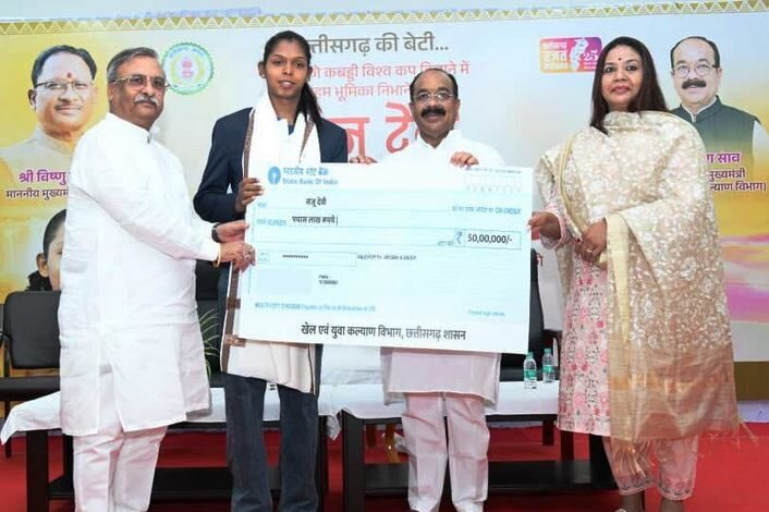 रायपुर, भारत को कबड्डी विश्वकप और एशियन चैंपियनशिप दिलाने में अहम भूमिका निभाने वाली संजू देवी को राज्य शासन के खेल एवं युवा कल्याण विभाग द्वारा 50 लाख रुपए की प्रोत्साहन राशि प्रदान की गई है। छत्तीसगढ़ में पहली बार किसी खिलाड़ी को इतनी बड़ी प्रोत्साहन राशि दी गई है। उप मुख्यमंत्री तथा खेल एवं युवा कल्याण मंत्री श्री अरुण साव ने आज नवा रायपुर स्थित अपने निवास कार्यालय में आयोजित सम्मान समारोह में उन्हें यह राशि सौंपी। श्री साव ने इस दौरान बिलासपुर के चिंगराजपारा कबड्डी क्लब को कबड्डी मैट भी प्रदान किया।